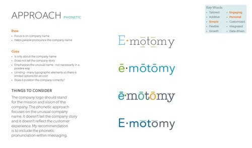 The client’s directive was to design logos that spelled the unusual company name phonetically - a direction I disagree with. The other request was to make it look “techy.” In this presentation, I am building the case that both directions do not serve the overall purpose of the logo, which is to tell the company story and reflect the customer experience with Emotomy.